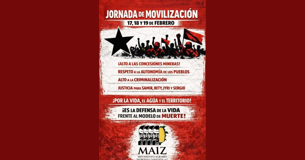 El Movimiento Agrario Indígena Zapatista (MAIZ), con 27 años de historia organizativa y resistencia territorial, convoca a una Jornada de Movilización los días 17, 18 y 19 de febrero ante el avance del modelo extractivista y la profundización de mecanismos de control político sobre nuestros pueblos.