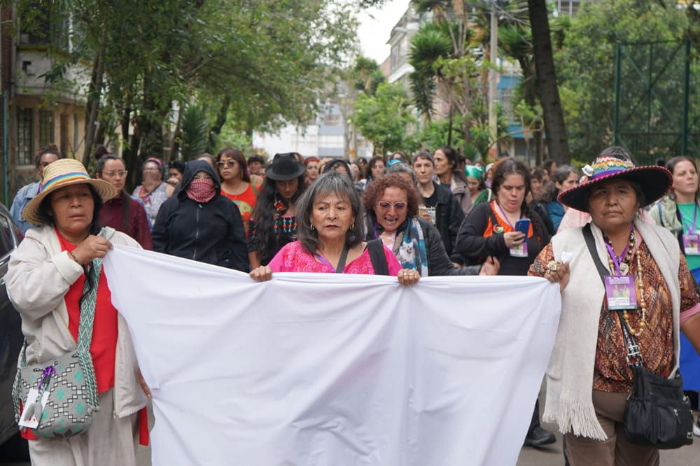 La memoria se extendió a Abya Yala y otros territorios: se nombró la desaparición de los restos de Camilo Torres Restrepo; los diez años del asesinato de Berta Cáceres, denunciando redes de financiamiento internacional detrás del crimen; y la vigencia del legado de lideresas y luchadoras cuyos nombres fueron pronunciados para afirmar que no están ausentes: “están vivas y son semillas”. Se reiteró la consigna contra los feminicidios y desapariciones —“Ni una asesinada más, ni una desaparecida más”— abrazando la lucha de las madres buscadoras.