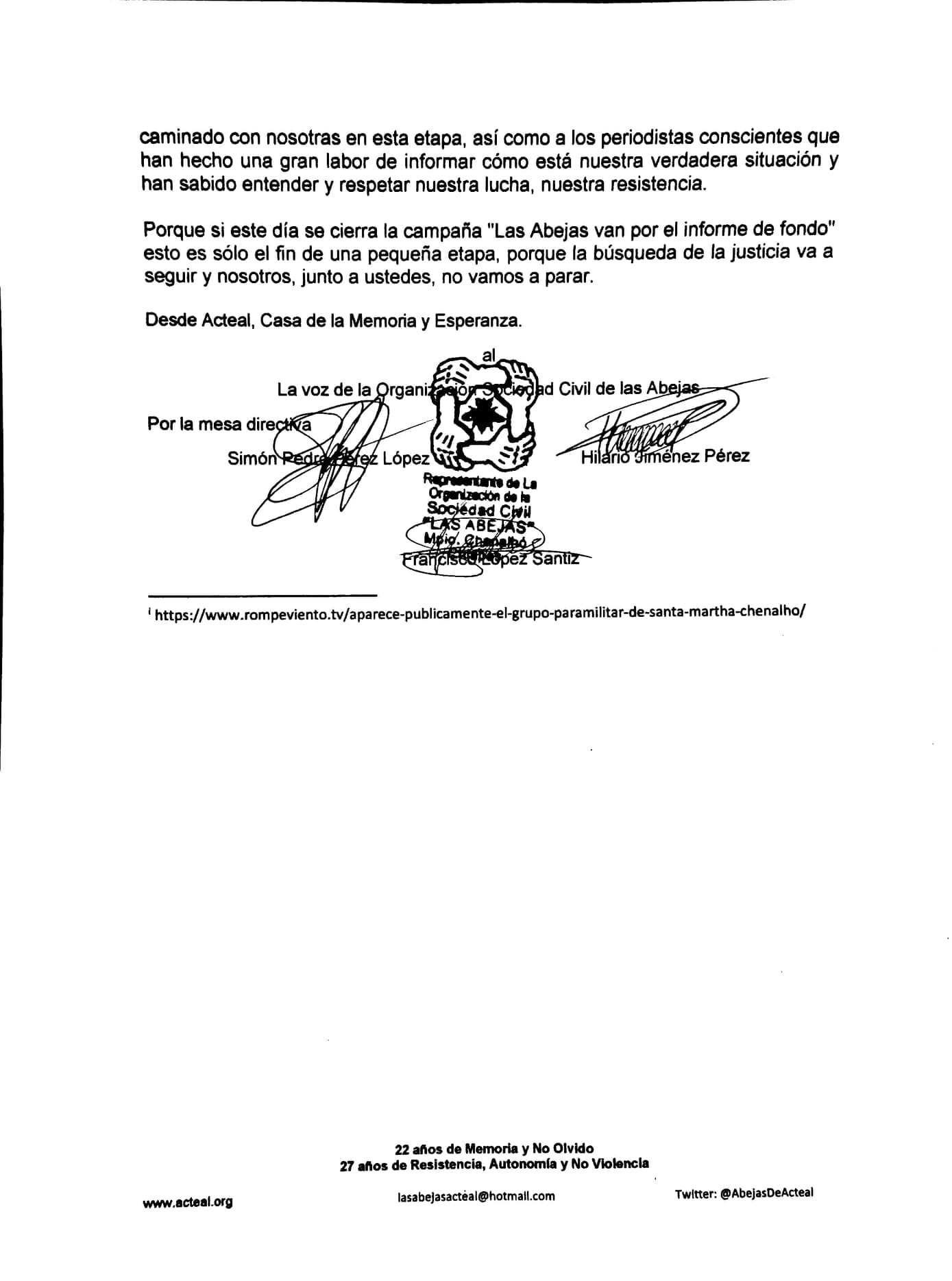 Porque si este día se cierra la campaña “Las Abejas van por el informe de fondo” esto es sólo el fin de una pequeña etapa, porque la búsqueda de la justicia va a seguir y nosotros, junto a ustedes, no vamos a parar.