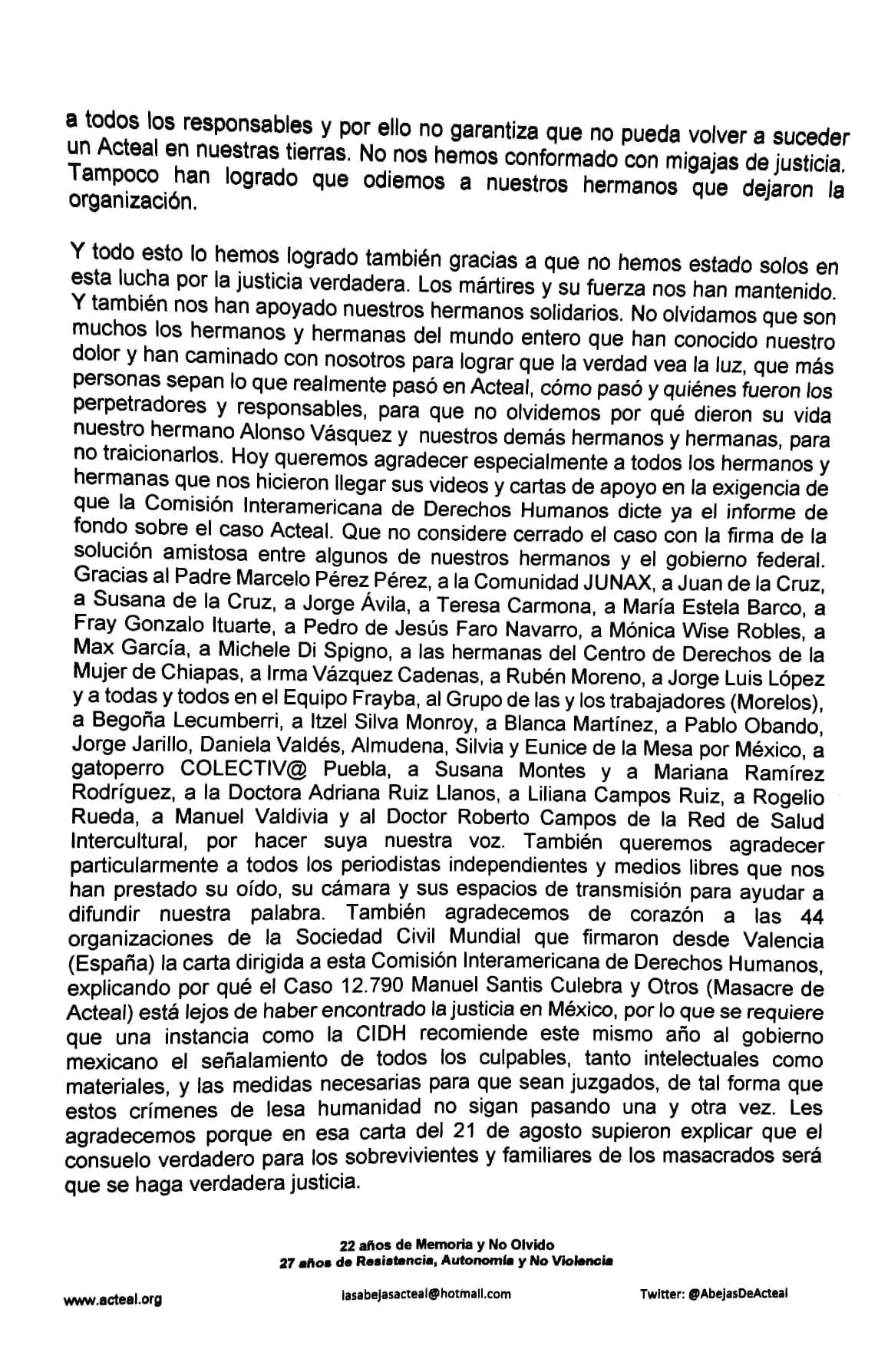 Y todo esto lo hemos logrado también gracias a que no hemos estado solos en esta lucha por la justicia verdadera. Los mártires y su fuerza nos han mantenido. Y también nos han apoyado nuestros hermanos solidarios. No olvidamos que son muchos los hermanos y hermanas del mundo entero que han conocido nuestro dolor y han caminado con nosotros para lograr que la verdad vea la luz, que más personas sepan lo que realmente pasó en Acteal, cómo pasó y quiénes fueron los perpetradores y responsables, para que no olvidemos por qué dieron su vida nuestro hermano Alonso Vásquez y nuestros demás hermanos y hermanas, para no traicionarlos. Hoy queremos agradecer especialmente a todos los hermanos y hermanas que nos hicieron llegar sus videos y cartas de apoyo en la exigencia de que la Comisión Interamericana de Derechos Humanos dicte ya el informe de fondo sobre el caso Acteal. Que no considere cerrado el caso con la firma de la solución amistosa entre algunos de nuestros hermanos y el gobierno federal. Gracias al Padre Marcelo Pérez Pérez, a la Comunidad JUNAX, a Juan de la Cruz, a Susana de la Cruz, a Jorge Ávila, a Teresa Carmona, a María Estela Barco, a Fray Gonzalo Ituarte, a Pedro de Jesús Faro Navarro, a Mónica Wise Robles, a Max García, a Michele Di Spigno, a las hermanas del Centro de Derechos de la Mujer de Chiapas, a Irma Vázquez Cadenas, a Rubén Moreno, a Jorge Luis López y a todas y todos en el Equipo Frayba, al Grupo de las y los trabajadores (Morelos), a Begoña Lecumberri, a Itzel Silva Monroy, a Blanca Martínez, a Pablo Obando, Jorge Jarillo, Daniela Valdés, Almudena, Silvia y Eunice de la Mesa por México, a gatoperro COLECTIV@ Puebla, a Susana Montes y a Mariana Ramírez Rodríguez, a la Doctora Adriana Ruiz Llanos, a Liliana Campos Ruiz, a Rogelio Rueda, a Manuel Valdivia y al Doctor Roberto Campos de la Red de Salud Intercultural, por hacer suya nuestra voz. También queremos agradecer particularmente a todos los periodistas independientes y medios libres que nos han prestado su oído, su cámara y sus espacios de transmisión para ayudar a difundir nuestra palabra. También agradecemos de corazón a las 44 organizaciones de la Sociedad Civil Mundial que firmaron desde Valencia (España) la carta dirigida a esta Comisión Interamericana de Derechos Humanos, explicando por qué el Caso 12.790 Manuel Santis Culebra y Otros (Masacre de Acteal) está lejos de haber encontrado la justicia en México, por lo que se requiere que una instancia como la CIDH recomiende este mismo año al gobierno mexicano el señalamiento de todos los culpables, tanto intelectuales como materiales, y las medidas necesarias para que sean juzgados, de tal forma que estos crímenes de lesa humanidad no sigan pasando una y otra vez. Les agradecemos porque en esa carta del 21 de agosto supieron explicar que el consuelo verdadero para los sobrevivientes y familiares de los masacrados será que se haga verdadera justicia.