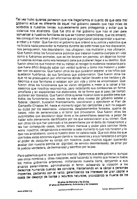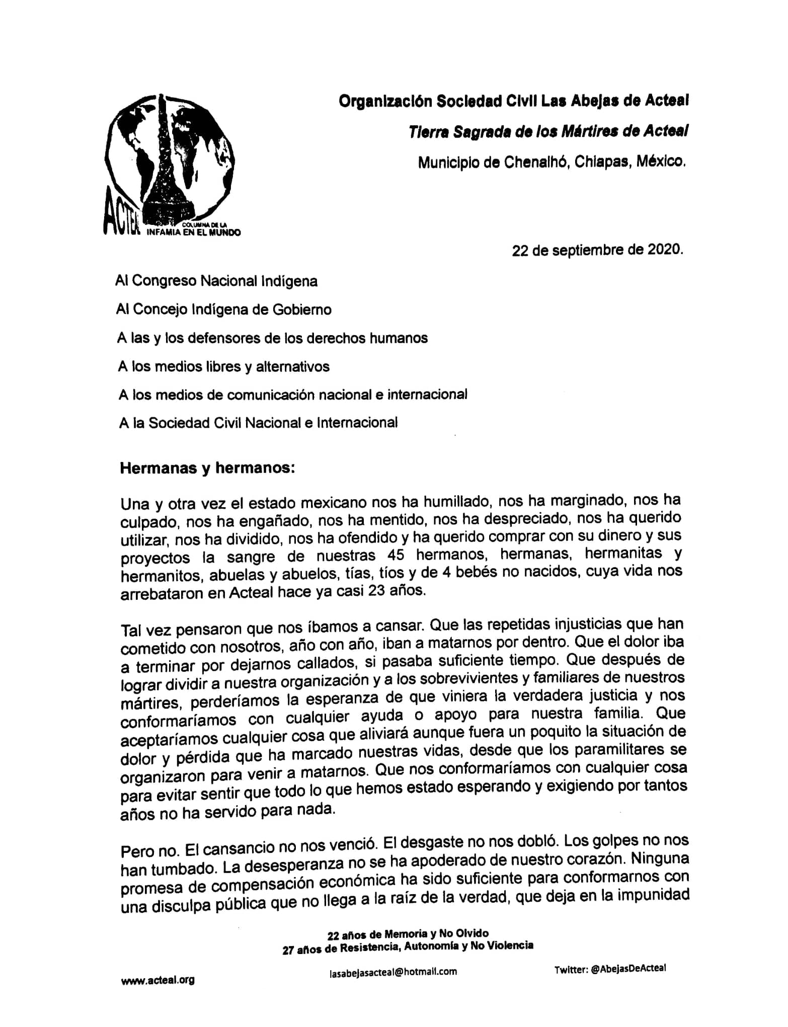 Las Abejas de Acteal no son indiferentes a los sufrimientos, los ataques, los muertos, los heridos y el desplazamiento forzado en Aldama, los compañeros muertos y heridos en los ataques en Tila, el robo de café y destrucción de bodegas comunitarias en el Municipio Autónomo Zapatista Lucio Cabañas, entre otros. No podemos aceptar una disculpa pública, mientras vemos que por la impunidad construída, se siguen muriendo y están sufriendo compas, hermanas y hermanos. La No violencia de Las Abejas de Acteal no es eso.