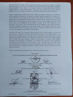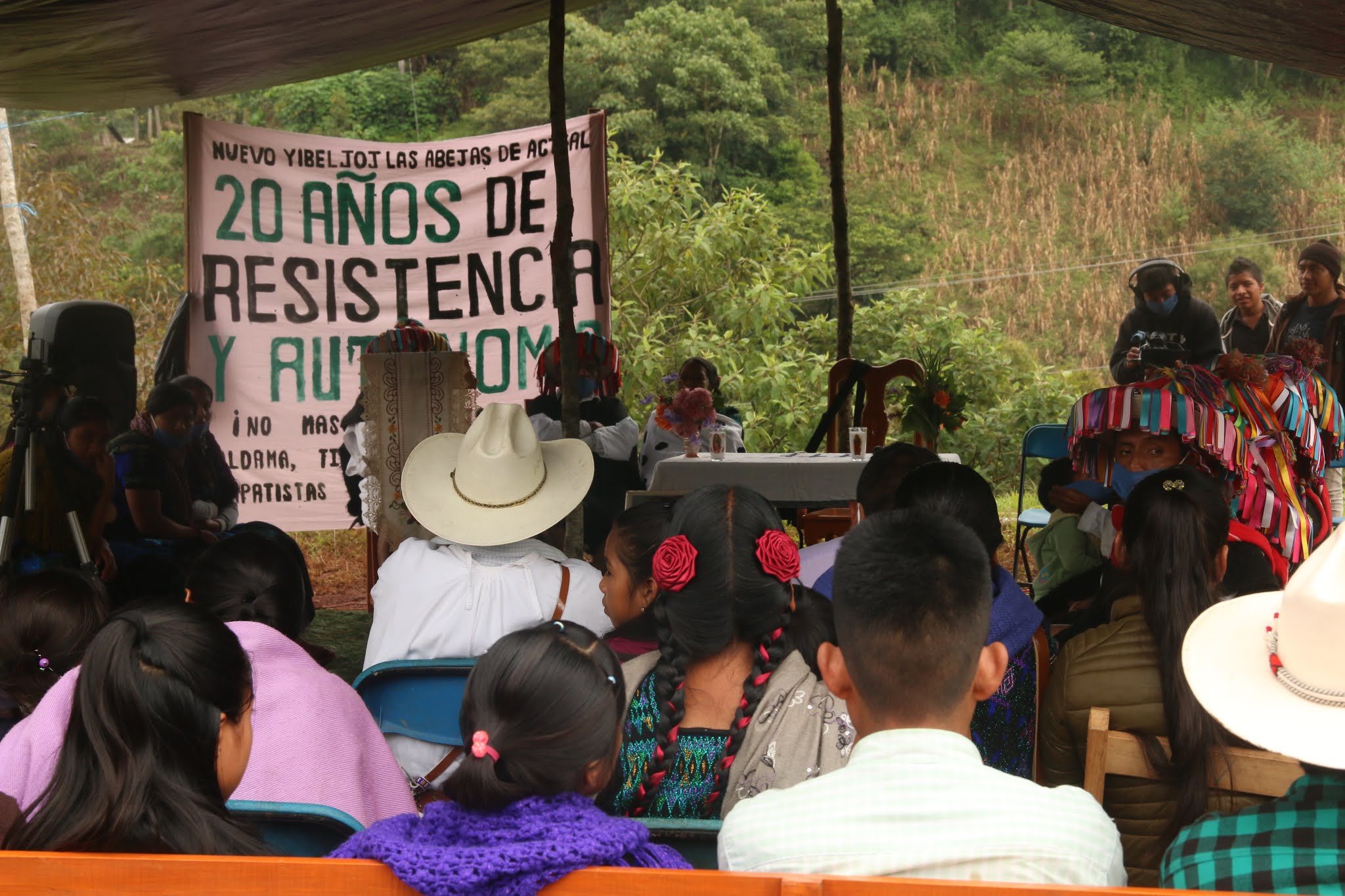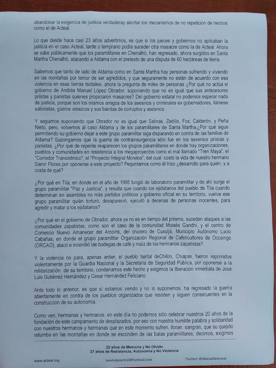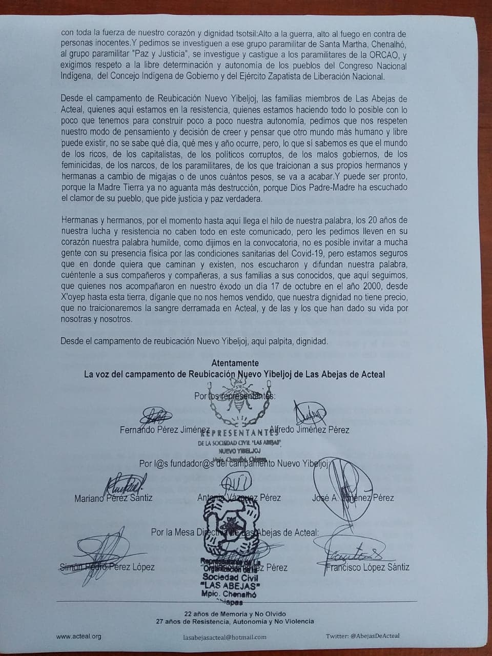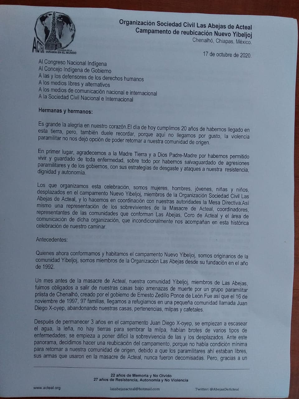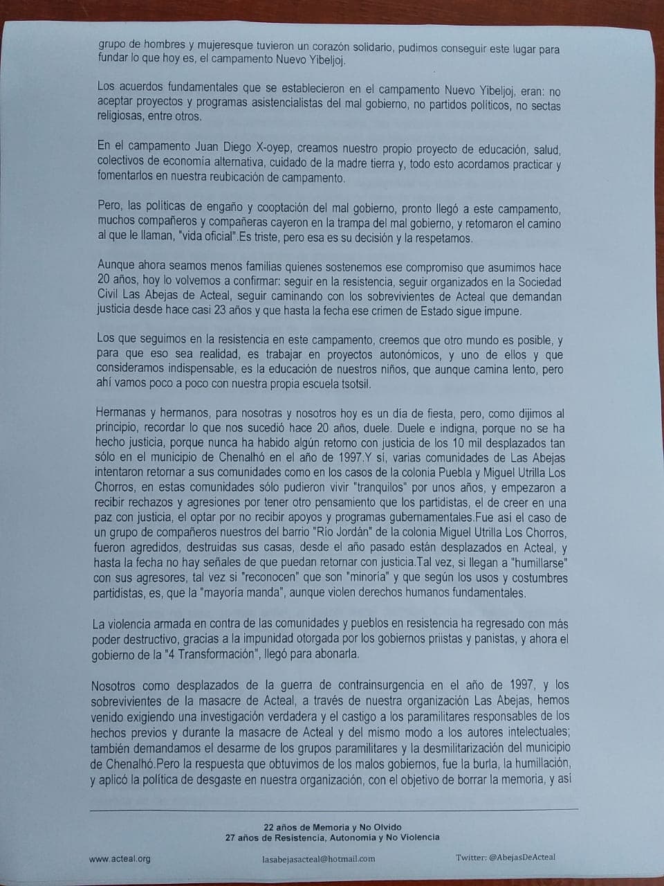 Desde el campamento de Reubicación Nuevo Yibeljoj, las familias miembros de Las Abejas de Acteal, quienes aquí estamos en la resistencia, quienes estamos haciendo todo lo posible con lo poco que tenemos para construir poco a poco nuestra autonomía, pedimos que nos respeten nuestro modo de pensamiento y decisión de creer y pensar que otro mundo más humano y libre puede existir, no se sabe qué día, qué mes y año ocurre, pero, lo que sí sabemos es que el mundo de los ricos, de los capitalistas, de los políticos corruptos, de los malos gobiernos, de los feminicidas, de los narcos, de los paramilitares, de los que traicionan a sus propios hermanos y hermanas a cambio de migajas o de unos cuántos pesos, se va a acabar.Y puede ser pronto, porque la Madre Tierra ya no aguanta más destrucción, porque Dios Padre-Madre ha escuchado el clamor de su pueblo, que pide justicia y paz verdadera.