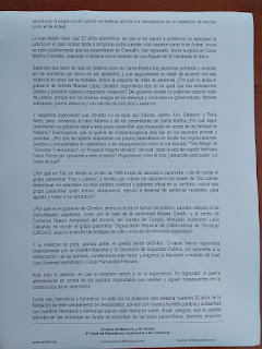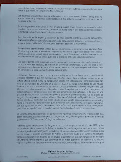 Como ven, hermanas y hermanos, en este día no podemos sólo celebrar nuestros 20 años de la fundación de este campamento de desplazados, por eso con nuestra humilde palabra y solidaridad con nuestros hermanos y hermanas que en este momento sufren, lloran, sangran, que su quejido retumba en las montañas en donde se esconden de las balas paramilitares; decimos, exigimos con toda la fuerza de nuestro corazón y dignidad tsotsil: Alto a la guerra, alto al fuego en contra de personas inocentes.Y pedimos se investiguen a ese grupo paramilitar de Santa Martha, Chenalhó, al grupo paramilitar “Paz y Justicia”, se investigue y castigue a los paramilitares de la ORCAO, y exigimos respeto a la libre determinación y autonomía de los pueblos del Congreso Nacional Indígena, del Concejo Indígena de Gobierno y del Ejército Zapatista de Liberación Nacional.