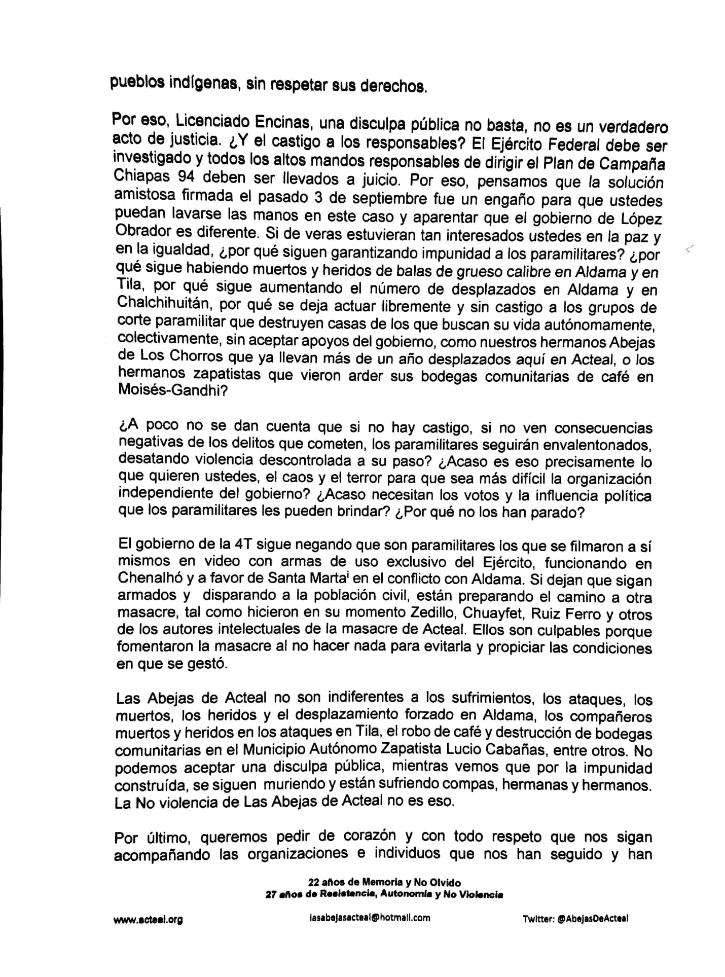 Las Abejas de Acteal no son indiferentes a los sufrimientos, los ataques, los muertos, los heridos y el desplazamiento forzado en Aldama, los compañeros muertos y heridos en los ataques en Tila, el robo de café y destrucción de bodegas comunitarias en el Municipio Autónomo Zapatista Lucio Cabañas, entre otros. No podemos aceptar una disculpa pública, mientras vemos que por la impunidad construída, se siguen muriendo y están sufriendo compas, hermanas y hermanos. La No violencia de Las Abejas de Acteal no es eso.