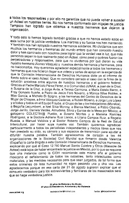 Y todo esto lo hemos logrado también gracias a que no hemos estado solos en esta lucha por la justicia verdadera. Los mártires y su fuerza nos han mantenido. Y también nos han apoyado nuestros hermanos solidarios. No olvidamos que son muchos los hermanos y hermanas del mundo entero que han conocido nuestro dolor y han caminado con nosotros para lograr que la verdad vea la luz, que más personas sepan lo que realmente pasó en Acteal, cómo pasó y quiénes fueron los perpetradores y responsables, para que no olvidemos por qué dieron su vida nuestro hermano Alonso Vásquez y nuestros demás hermanos y hermanas, para no traicionarlos. Hoy queremos agradecer especialmente a todos los hermanos y hermanas que nos hicieron llegar sus videos y cartas de apoyo en la exigencia de que la Comisión Interamericana de Derechos Humanos dicte ya el informe de fondo sobre el caso Acteal. Que no considere cerrado el caso con la firma de la solución amistosa entre algunos de nuestros hermanos y el gobierno federal. Gracias al Padre Marcelo Pérez Pérez, a la Comunidad JUNAX, a Juan de la Cruz, a Susana de la Cruz, a Jorge Ávila, a Teresa Carmona, a María Estela Barco, a Fray Gonzalo Ituarte, a Pedro de Jesús Faro Navarro, a Mónica Wise Robles, a Max García, a Michele Di Spigno, a las hermanas del Centro de Derechos de la Mujer de Chiapas, a Irma Vázquez Cadenas, a Rubén Moreno, a Jorge Luis López y a todas y todos en el Equipo Frayba, al Grupo de las y los trabajadores (Morelos), a Begoña Lecumberri, a Itzel Silva Monroy, a Blanca Martínez, a Pablo Obando, Jorge Jarillo, Daniela Valdés, Almudena, Silvia y Eunice de la Mesa por México, a gatoperro COLECTIV@ Puebla, a Susana Montes y a Mariana Ramírez Rodríguez, a la Doctora Adriana Ruiz Llanos, a Liliana Campos Ruiz, a Rogelio Rueda, a Manuel Valdivia y al Doctor Roberto Campos de la Red de Salud Intercultural, por hacer suya nuestra voz. También queremos agradecer particularmente a todos los periodistas independientes y medios libres que nos han prestado su oído, su cámara y sus espacios de transmisión para ayudar a difundir nuestra palabra. También agradecemos de corazón a las 44 organizaciones de la Sociedad Civil Mundial que firmaron desde Valencia (España) la carta dirigida a esta Comisión Interamericana de Derechos Humanos, explicando por qué el Caso 12.790 Manuel Santis Culebra y Otros (Masacre de Acteal) está lejos de haber encontrado la justicia en México, por lo que se requiere que una instancia como la CIDH recomiende este mismo año al gobierno mexicano el señalamiento de todos los culpables, tanto intelectuales como materiales, y las medidas necesarias para que sean juzgados, de tal forma que estos crímenes de lesa humanidad no sigan pasando una y otra vez. Les agradecemos porque en esa carta del 21 de agosto supieron explicar que el consuelo verdadero para los sobrevivientes y familiares de los masacrados será que se haga verdadera justicia.