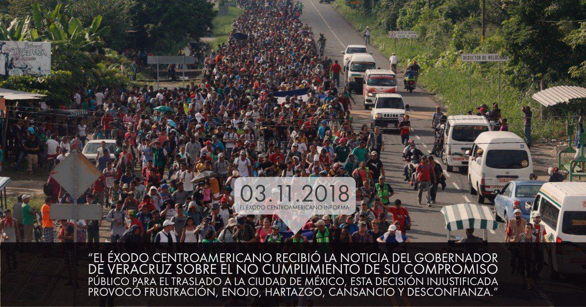 Este lunes 5 de noviembre salieron de Veracruz hacia Puebla y CDMX los más de 2 mil migrantes rezagados que se quedaron hasta la noche del domingo albergados en la ciudad de Córdoba, en el centro del estado, luego de 3 días en la entidad y 25 de travesía desde Honduras, Guatemala y El Salvador, de donde partieron la gran mayoría el 12 de octubre pasado.
