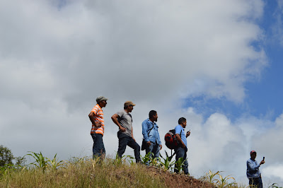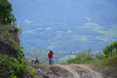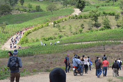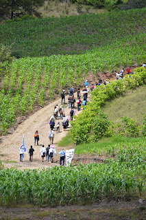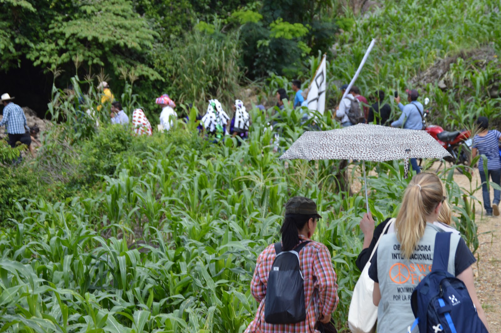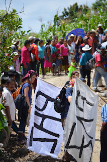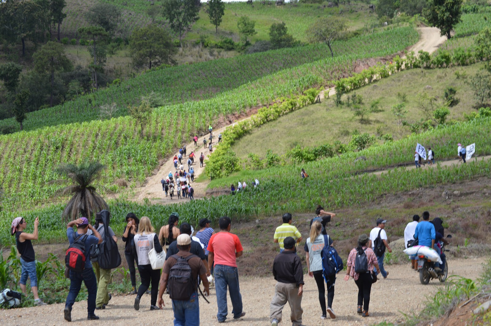 Después de dos horas de ruta, las banderas de Paz de Las Abejas ondeando, y una hora de terraceria, el contingente tuvo que terminar caminando en los caminos rodeado de milpa, l@s solidarios llegaron a las 11 :30am.