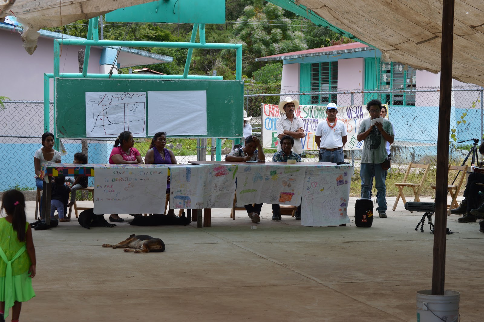 Al terminar, el compañero Adrian pudo presentar un mapa, evidenciando las raíces del conflicto, y mostrando que la lucha no es para robar grandes hectareas de tierras, pero para un pedazo estratégico. Recordó, como lo había mencionado Radio Zapatista en su nota, que de los cerros sagrados al lado de Cruzton, existe un gran interés de parte de las empresas mineras para extraer oro, “ellos quieren todo, no nos dejarían nada” explico el compañero antes de invitar a los invitad@s a llevar sus palas para buscar ese famoso oro!
