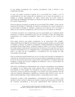 Ahora el agente municipal y la gente de la comunidad “Río Jordán”, dicen que se resolverá el problema y liberarán a nuestros compañeros en cuanto vayamos a la comunidad a arreglar el conflicto y pagando una multa de cinco mil pesos a cada uno de nuestros compañeros o de lo contrario no los dejarán en libertad.
