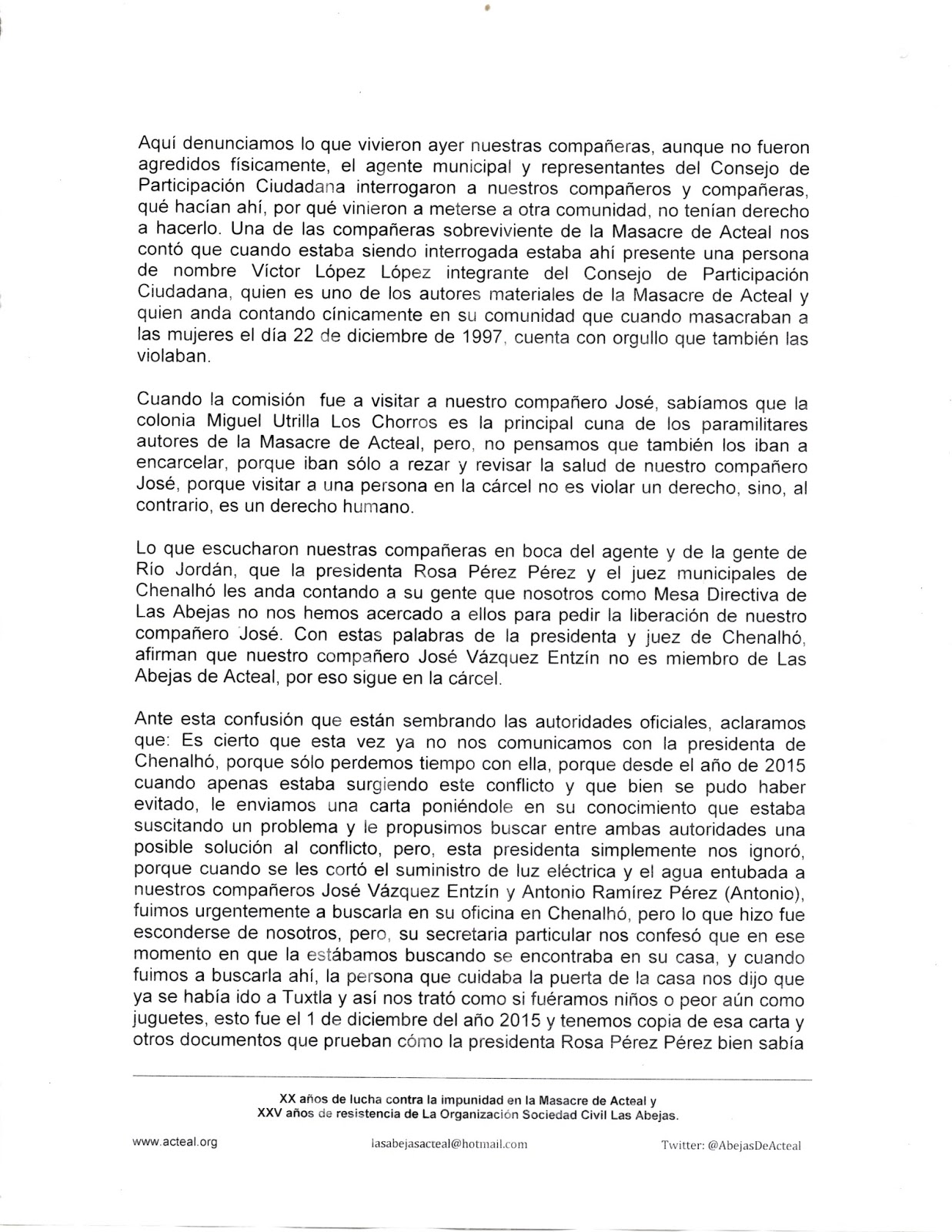 Aquí denunciamos lo que vivieron ayer nuestras compañeras, aunque no fueron agredidos físicamente, el agente municipal y representantes del Consejo de Participación Ciudadana interrogaron a nuestros compañeros y compañeras, qué hacían ahí, por qué vinieron a meterse a otra comunidad, no tenían derecho a hacerlo. Una de las compañeras sobreviviente de la Masacre de Acteal nos contó que cuando estaba siendo interrogada estaba ahí presente una persona de nombre Víctor López López integrante del Consejo de Participación Ciudadana, quien es uno de los autores materiales de la Masacre de Acteal y quien anda contando cínicamente en su comunidad que cuando masacraban a las mujeres el día 22 de diciembre de 1997, cuenta con orgullo que también las violaban.
