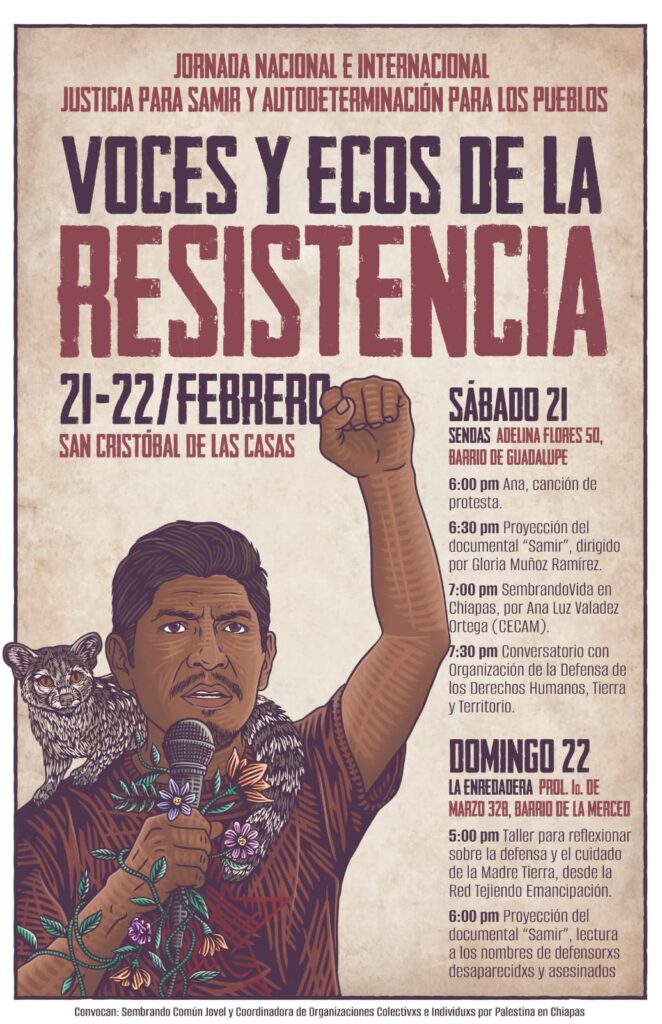 6:00 pm Proyección de “Samir” y lectura de los nombres de defensorxs asesinadxs y desaparecidxs