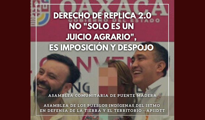 14. 26 de marzo de 2022, representantes de la comunidad indígena de Puente Madera sostuvimos una reunión con Rafael Marín Mollinedo titular del Corredor Interoceánico del Istmo de Tehuantepec (CIIT), Gonzalo Villalobos López representante de la PA en el Estado de Oaxaca, Lila Rodríguez Villanueva jefa de residencia de la PA en Tehuantepec; reunión llevada a cabo después de tanta insistencia por parte de la PA, en la que mantuvieron una actitud de criminalización y amenazas hacía nuestra comunidad.
