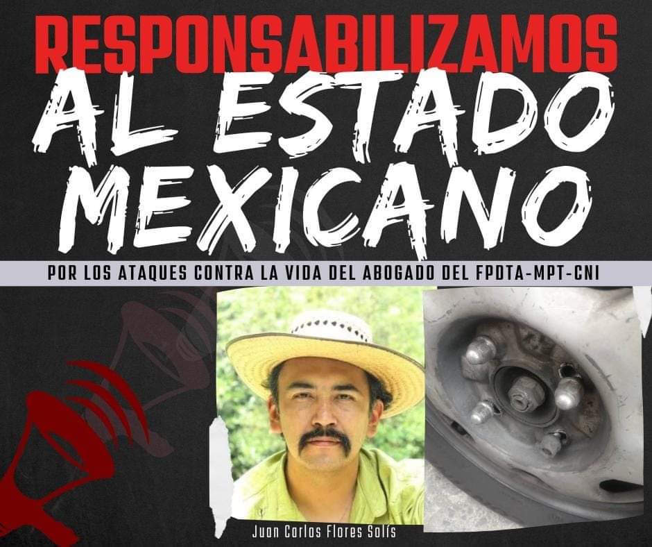 Responsabilizamos al Estado Mexicano sobre el incremento de los ataques en contra de la vida del abogado del FPDTA-MPT-CNI, Juan Carlos Flores Solís