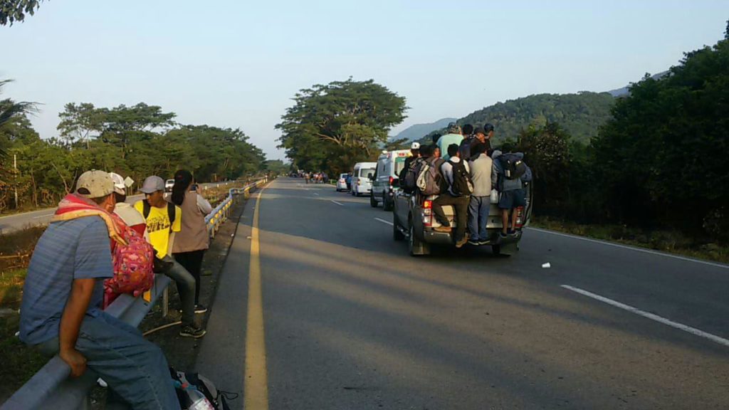 Constatamos en estos dos días que el Estado mexicano continua apostando por una estrategia de, disuasión y desgaste para que las personas migrantes desistan en su caminar. Este 9 de Noviembre, el Instituto Nacional de Migración (INM) realizó distintos operativos de detención en la entrada al Estado de Oaxaca –a la altura del municipio de Tapanatepec- , con el uso de violencia y en momentos de ausencia de organizaciones observadoras de Derechos Humanos y de la CNDH. Estos operativos dejaron un saldo de aproximadamente 30 personas detenidas, incluyendo familias completas y menores de edad. Asimismo, hay una intención, que a primera vista luce contradictoria, de forzar la aceleración de la movilidad de los grupos con la acción de Policía Federal, INM (incluyendo el Grupo Beta) y otras entidades federales y estatales de conseguir aventones para las personas migrantes.