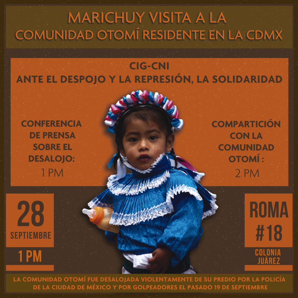 La cita es este 28 de septiembre, a las 13:00 hrs. en Roma 18, Col. Juárez. Deleg. Cuauhtémoc. Así mismo, anunciamos la realización de una conferencia de prensa, con la Comunidad Otomí y la participación de nuestra Vocera MARICHUY, al finalizar, una compartición.