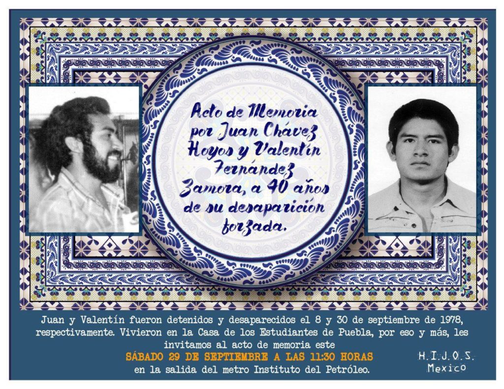 Juan y Valentín fueron detenidos y desaparecidos el 8 y 30 de septiembre de 1878, respectivamente. H.I.J.O.S. México invita al acto de memoria este sábado 29 de septiembre a las 11:30 am, a la salida del metro Instituto del Petróleo, CDMX.