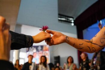 El segundo panel condensó esa fuerza. Celebró la juntanza como acto político y como gesto radical frente a la fragmentación. Las voces fueron múltiples: mujeres de barrio, mujeres indígenas, defensoras de derechos, mujeres amazónicas protectoras del bosque, sembradoras de agua, madres buscadoras de personas desaparecidas, madres de víctimas de feminicidio, trabajadoras del campo y la ciudad. No solo hablaron quienes estaban en la mesa; el público también tomó la palabra, borrando las fronteras entre quien expone y quien escucha. Las intervenciones se entrelazaron como si siempre hubieran sabido encontrarse, hilando experiencias distintas en una trama común.